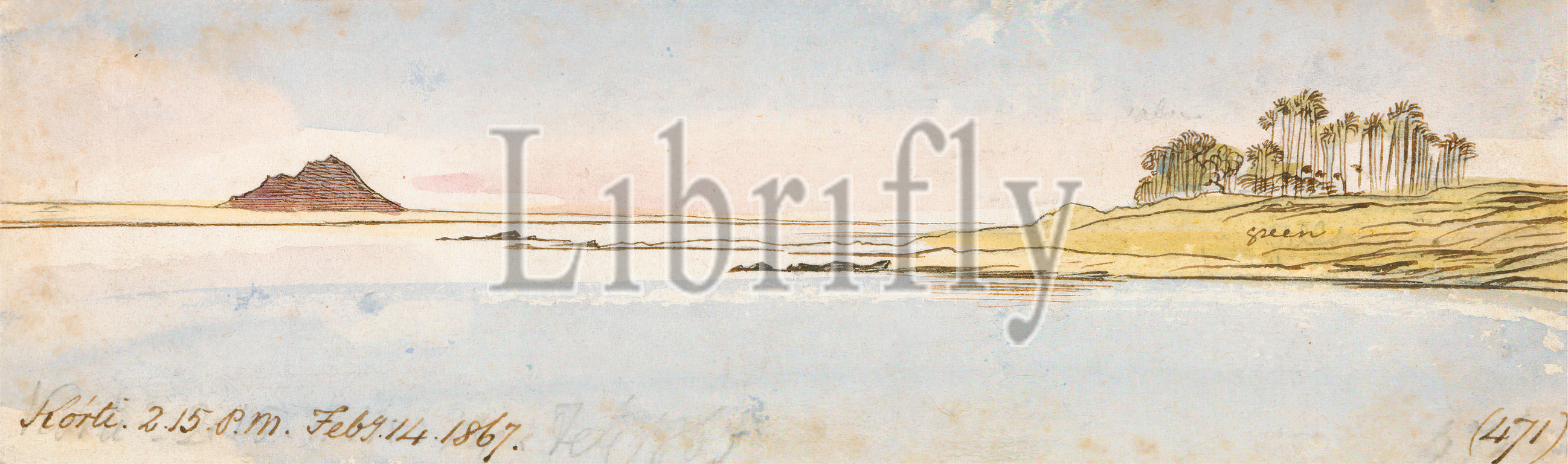 Korti, Edward Lear, 1812–1888, British, 1867, Watercolor, graphite, pen, brown ink, medium, slightly textured, wove paper, mounted, moderately thick, moderately textured, cream wove paper, Sheet, hill, landscape, palm trees, river, river, riverbank, sky, water, Africa, Korti, Nile, Sudan