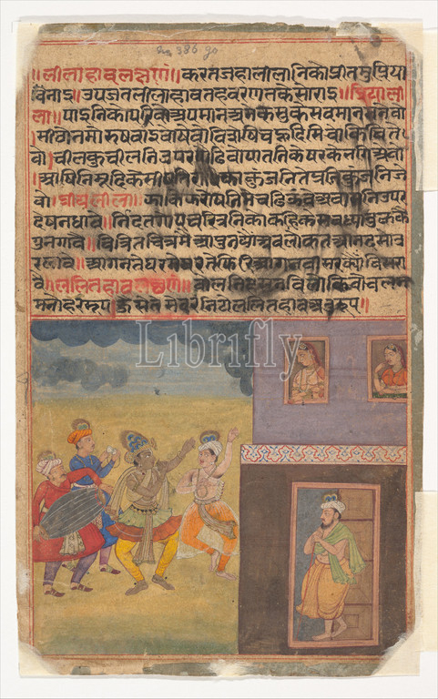 Krishna Dancing, Page, Dispersed, Boston, Rasikapriya, Lover, Breviary, ca, 1610, India, Rajasthan, Amber, Ink, opaque watercolor, gold, paper, Image, 8 1/2, 5 1/4, 21.6, 13.3 cm, Paintings, plays, flute, dances, peacocks, monsoon, chorus, drums, cymbals, manuscript, illuminations, influence, Mughal art