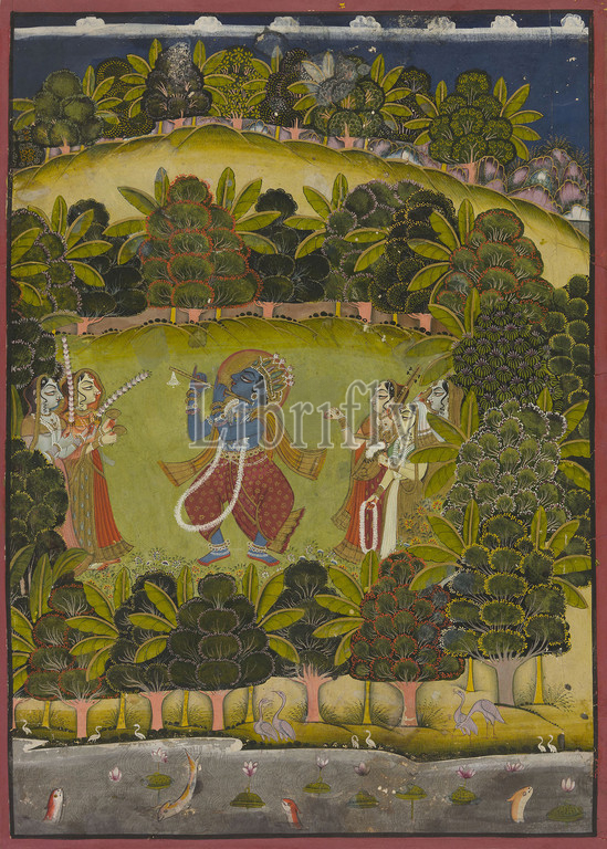 Krishna Fluting, Gopis, Late 18th, early 19th century, India, Rajasthan, Jodhpur, Opaque watercolor, gold, tin alloy, paper, 65