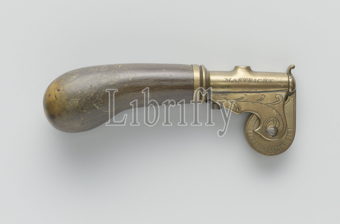 Kruittester, Pocket-sized Kruitester, handle, cow horn, brass ring, front, short course, test mechanism, previously gilded brass, mounted, ringed plate, soldered, sun hole, top, loop, signed, mounting plate, soldered underneath, barrel, engraved, scroll, attached, wheel, numbers 1, 9, ends, valve, trumpet, Maastricht, Paulus van Walsen, attributed, 1668, 1715, horn, animal material, brass, alloy, engraving, l 12 8 cm