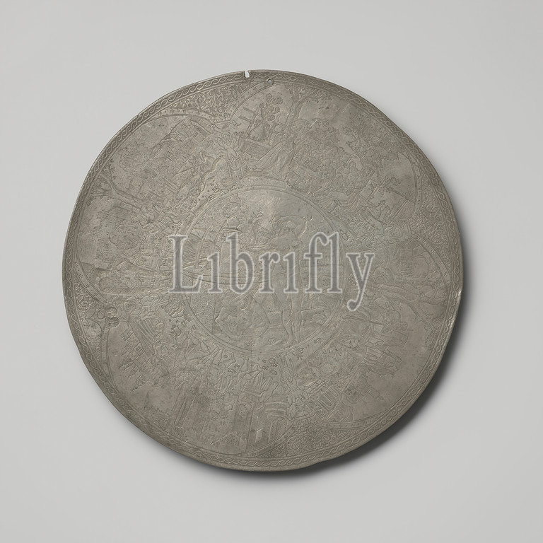 Kuchenplatte with Pyramus and Thisbe and scenes from the life of the Lost Son, Round tin plaque, a so-called 'Kuchenplatte'. In the center is a depiction of Pyramus and Thisbe engraved in a circle near a fountain. Around it four scenes from the life of the Lost Son, clockwise from the top left: the son says goodbye to his father, the son celebrates at the table, the son as a pig farmer and the son returns to his father's knees. The scenes are separated from each other by a caryatid., anonymous, Frankfurt am Main, after c. 1525 - before c. 1575, tin (metal), engraving, h 0.1 cm × d 29.0 cm