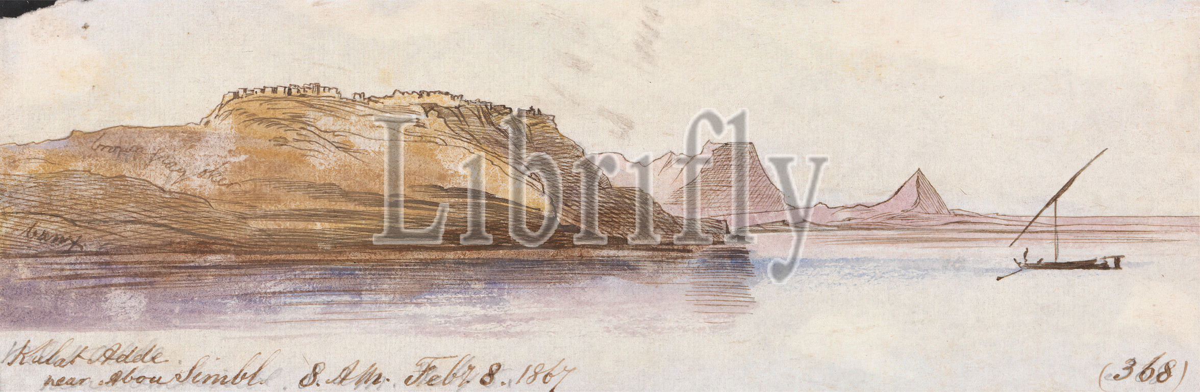 Kulat Adde, Abu Simbel, Edward Lear, 1812–1888, British, 1867, Watercolor, graphite, gouache, pen, brown ink, medium, slightly textured, cream wove paper, boat, hills, lake, landscape, pyramid, tomb, riverbank, structures, single built works, water, Africa, Egypt, Lake Nasser, Nubia