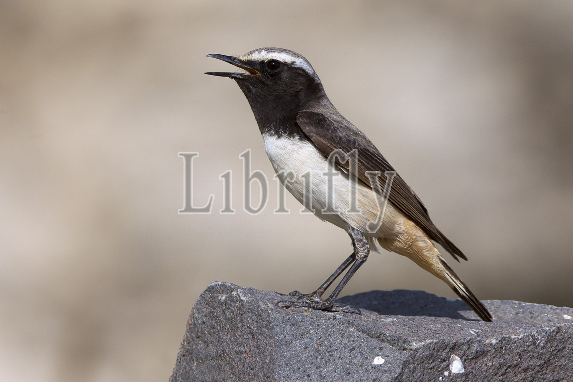Kurdish Wheatear male singing on rock, Oenanthe xanthoprymna