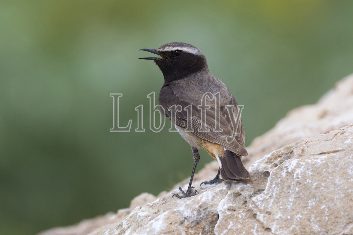Kurdish Wheatear male singing on rock, Oenanthe xanthoprymna
