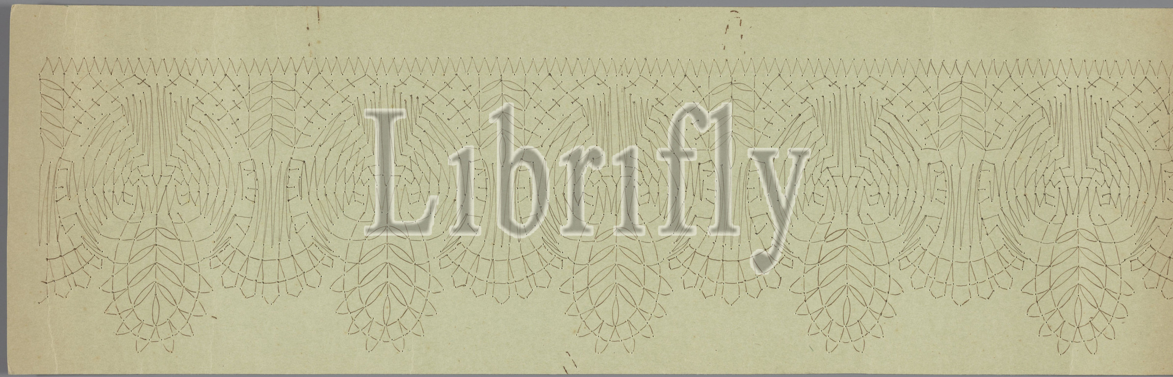 Lace pattern or lace pattern of the edge design of a tea tablecloth punctured on green paper, Lace letter or lace pattern of a design of a tea tablecloth. The border motif, made of five flowers, is drawn and punctured on a light green cardboard., L. Middendorp, Netherlands, c. 1925, cardboard, ink, drawing, l 54 cm × w 17 cm