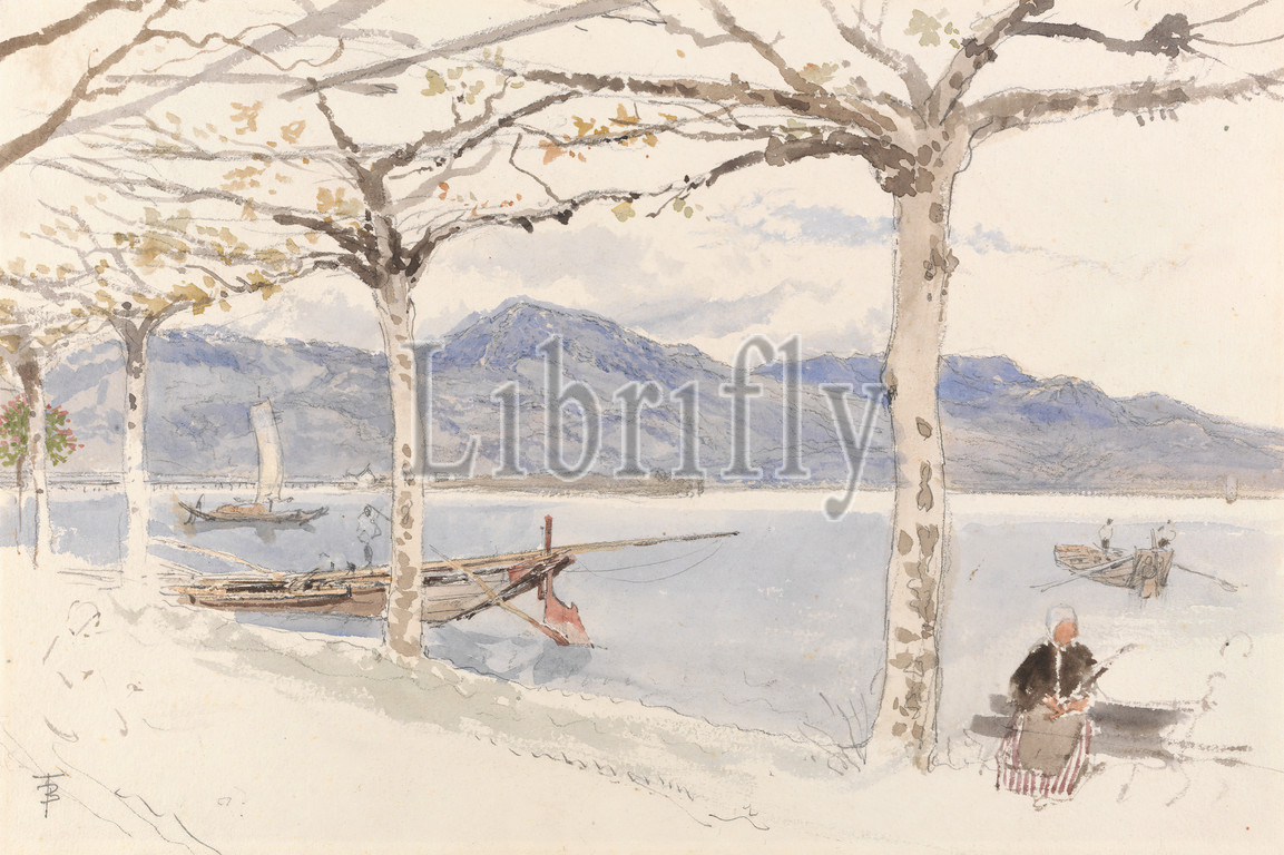 Lago Maggior, Italy, Myles Birket Foster, 1825–1899, British, undated, Watercolor and graphite on thick, rough, cream wove paper, Sheet: 8 1/8 × 12 1/4 inches (20.6 × 31.1 cm), boats, figures, lake, marine art, mountains, trees, Europe, Italy