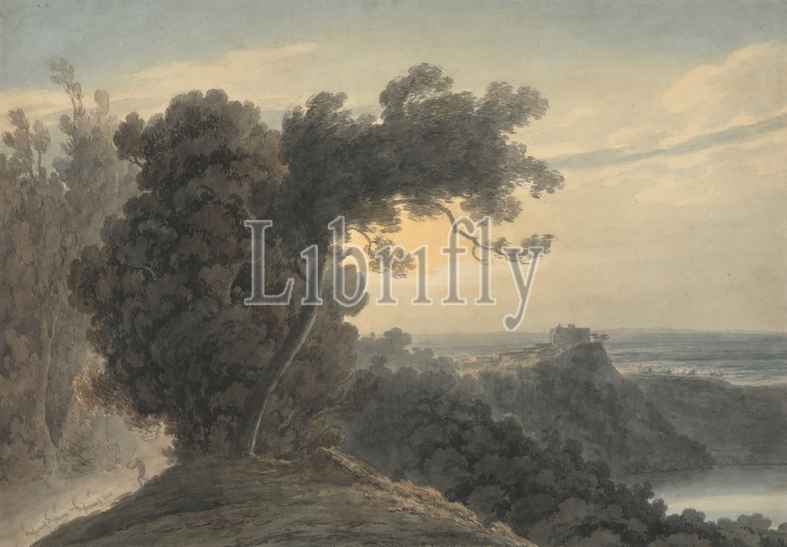 Lake, Albano, Castel Gandolfo, John Robert Cozens, 1752–1797, British, 1783, 1785, Watercolor, graphite, medium, slightly textured, cream wove paper, Sheet, castles, goats, Grand Tour, hills, landscape, shepherds, trees, Albano, Lago, Campagna, Castel Gandolfo, Italy