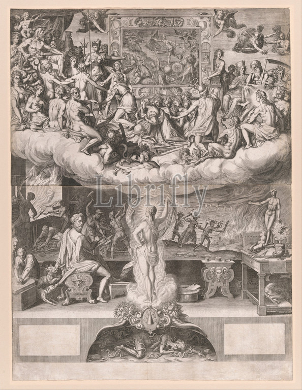 Lament, Art, Painting, 1579, Engraving, two plates printed, sheets, Sheet, upper plate, 14 1/4, 21 1/8, 36.2, 53.7 cm, Prints, Cornelis Cort, Netherlandish, Hoorn ca., 1533–1578, Rome, after Federico Zuccaro, Zuccari, Italian, Sant'Angelo in Vado, 1540/42–1609, Ancona, ambitious allegory, art, painting, highly personal work, generally accepted, print, prompted, criticism, Italian painter, Federico, Zuccaro, endured, finished, decoration, dome, Florence Cathedral, 1574