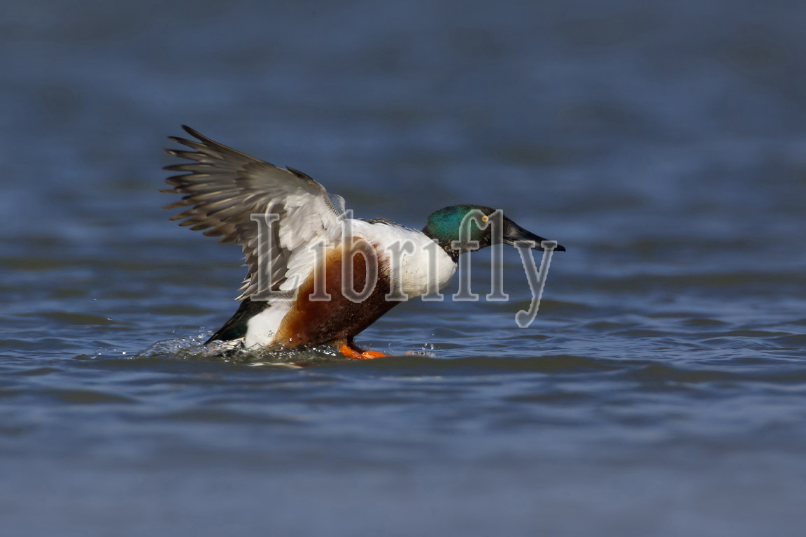 Landing male European Shoveler, Italy