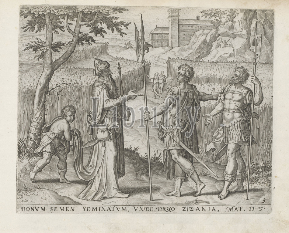 landlord inspects, fields Leeringhe Iesu, Gelyckenissen, series title, Parable, sower, Den Grooten Figuer-Bibel, servants, halberd, hands, ask, landlord if, should weed, weeds, grain, landlord replies, weeds must continue, grow, harvest, boy, holding, landlord's robe, performance, reference, Latin, Bible text, Mat, 13, 27, print, part, album, sowed good seeds, field, tares, wheat, Pieter Jalhea Furnius, 1568, 1646, paper, engraving