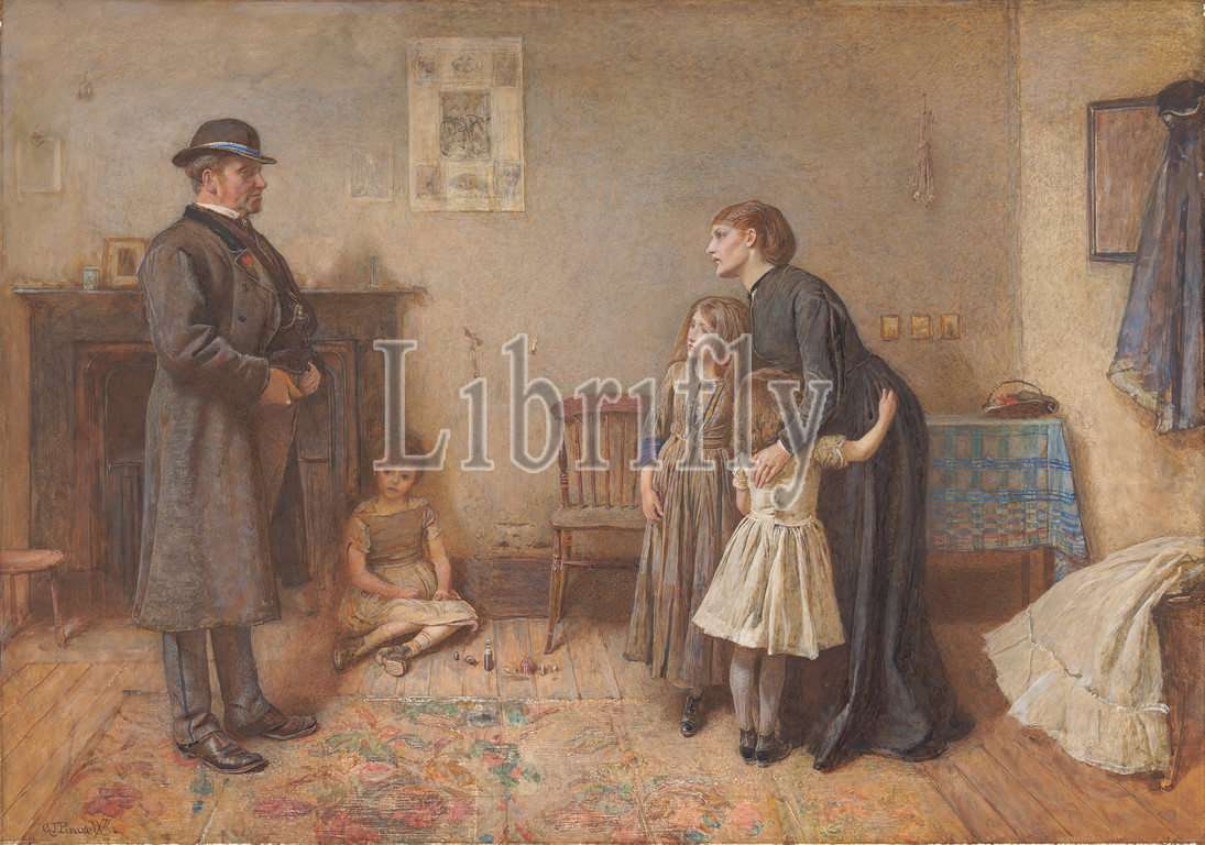 Landlord, Tenant, George John Pinwell, 1842–1875, British, 1871, Watercolor, gouache, moderately thick, slightly textured, cream wove paper, Sheet, basket, chair, children, fireplace, genre subject, girls, interior, landlord, mother, rug, table, tenant