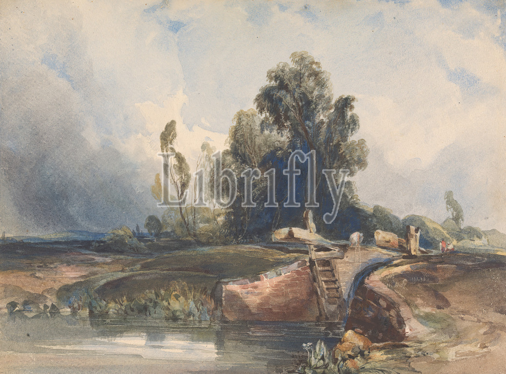 Landscape with Canal and Lock; Figures at Lock, Thomas Sully, 1783–1872, American, undated, Watercolor, pen in brown ink, graphite and gouache on moderately thick, moderately textured, beige, wove paper, Sheet: 9 7/8 × 13 1/4 inches (25.1 × 33.7 cm)