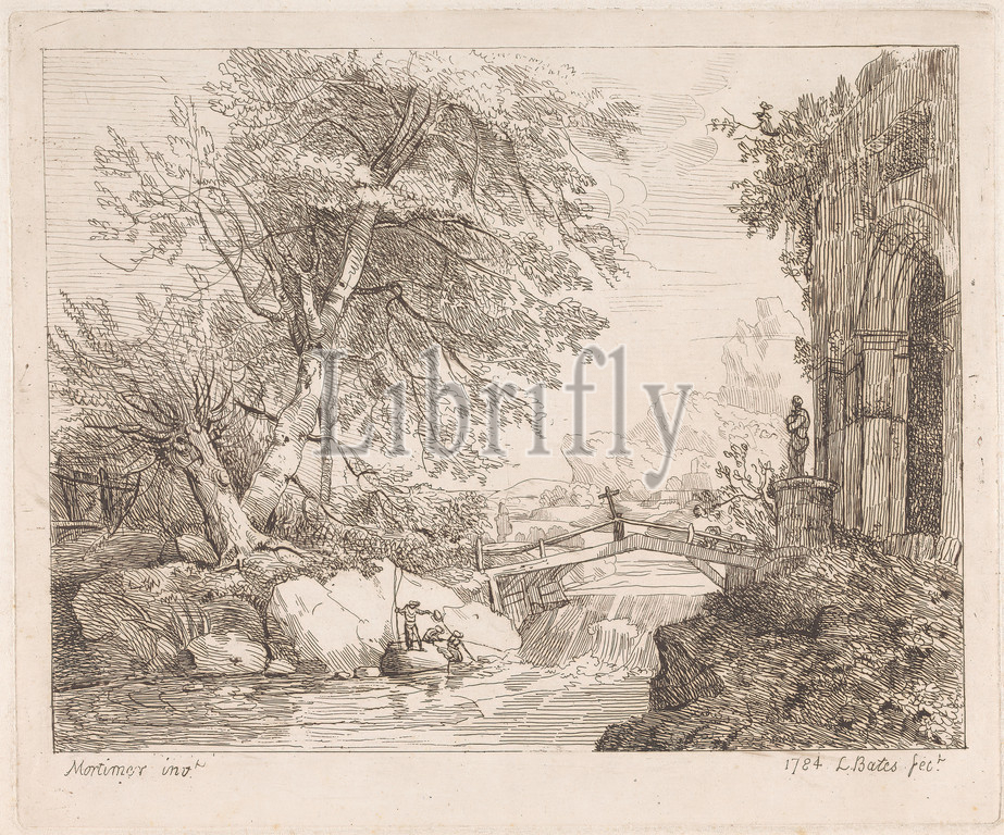 Landscape, Classical Ruins, Print, Lydia Bates, active 1784, John Hamilton Mortimer, 1740–1779, British, 1784, Etching, moderately thick, moderately textured, cream laid paper, Sheet, Plate, Image, boulders, bridge, built work, children, church, Classical, cross, object, fishing, fishing poles, Grand Tour, hats, landscape, river, rocks, landforms, ruins, shrubs, statue, stream, trees, waterfall