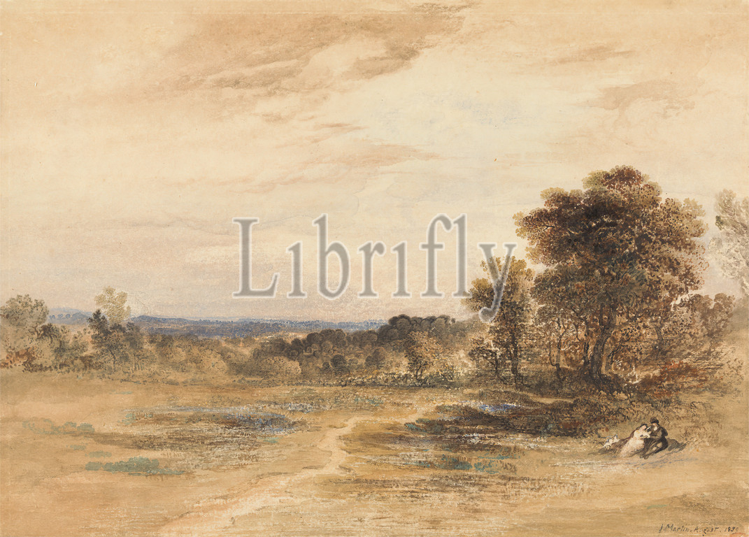 Landscape, Courting Couple, John Martin, 1789–1854, British, 1839, Watercolor, gum, graphite, scratching out, medium, slightly textured, cream wove paper mounted, board, Sheet, couple, courting, embrace, field, genre subject, landscape, love, lovers, man, mountains, trees, woman