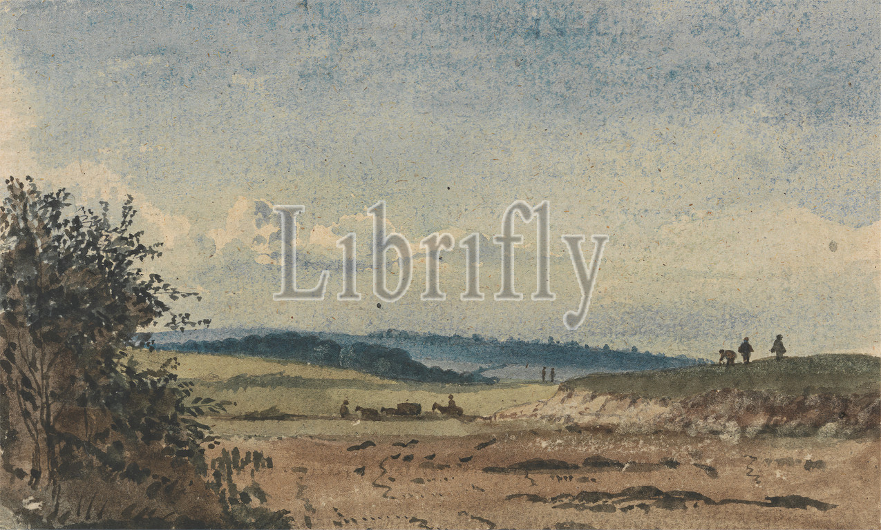 Landscape, Figures, Wagon, David Charles Read, 1790–1851, British, watercolor, medium, rough, beige, laid paper, Sheet, clouds, field, figures, representations, hills, horses, animals, landscape, sky, trees, wagon