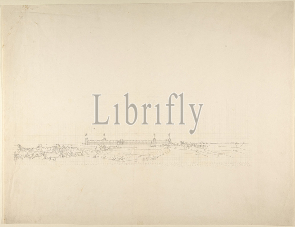 Landscape, Large Building, 1818–83, Graphite, squared, 14 7/8 x 19 1/2, 37.8 49.6 cm, Drawings, Franz von Hauslab the Younger, Austrian, Vienna, 1798–1883, Von Hauslab, little, figure, history, art, private tutor, future Emperor, Franz, Joseph, I, high-ranking military, officer, innovative cartographer, traveled widely, role, map maker, helps, explain, meticulousness, topographical drawing, although, building depicted, remains, unidentified