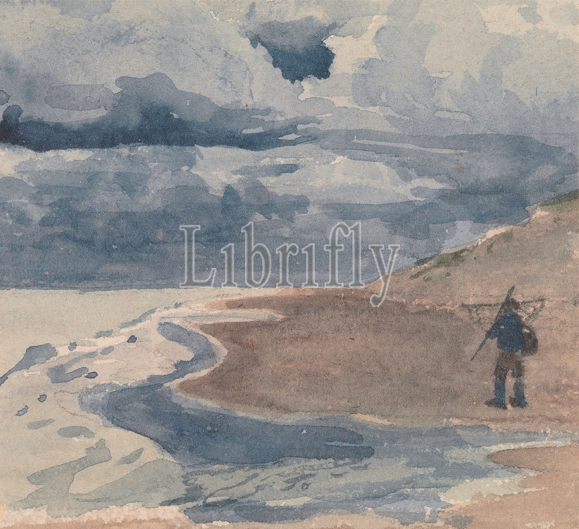 Landscape, Man, Beach, Attributed, William Collins, 1788–1847, British, Watercolor, graphite, medium, moderately textured, cream wove paper, Sheet, beach, clouds, coast, dunes, fishing, landscape, man, marine art, waves, natural events