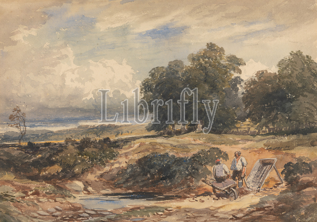 Landscape with Men Sifting Sand, David Cox Jr., 1809–1885, British, between 1850 and 1859, Watercolor, gouache, and graphite on moderately thick, rough, beige wove paper, Sheet: 11 3/4 x 16 3/4 inches (29.8 x 42.5 cm), laborers, landscape, sand, wheelbarrow