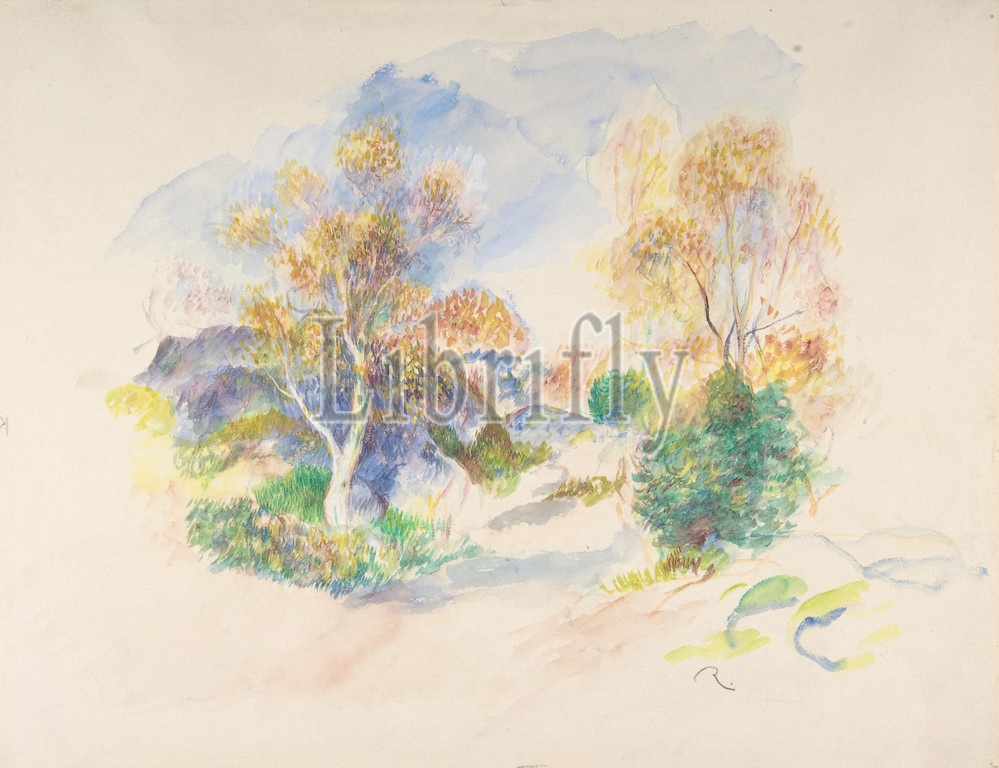 Landscape, Path, Trees, ca, 1886, Watercolor, touches, white gouache, wove paper, sheet, 10 13/16 x 13 13/16, 27.4 35.1 cm, Drawings, Auguste Renoir, French, Limoges, 1841–1919, Cagnes-sur-Mer