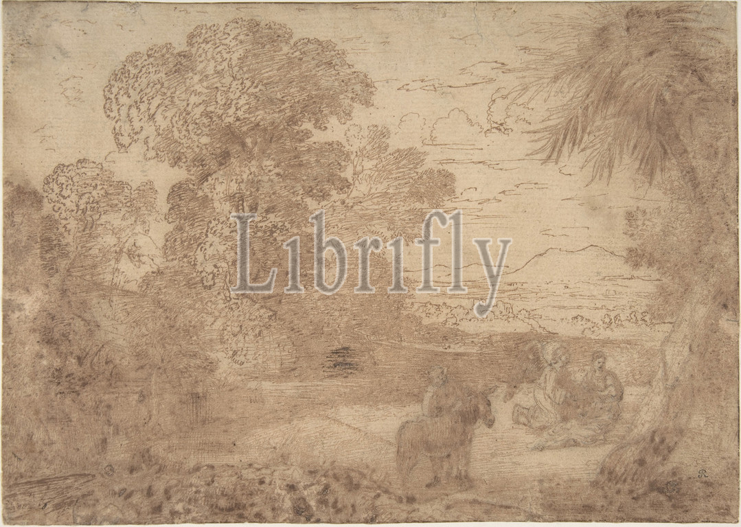 Landscape, Rest, Flight, Egypt, ca, 1635, Pen, brown ink, traces, black chalk, 7 1/2 x 10 1/2, 19, x 26.7 cm, Drawings, Claude Lorrain, Gellée, French, Chamagne, 1604/5?–1682, Rome, executed, drawings, paintings, biblical theme, any, subject, 1630s, repeatedly, revisited, theme, time varying, approach, creating variations, composition, full, various drawing, media