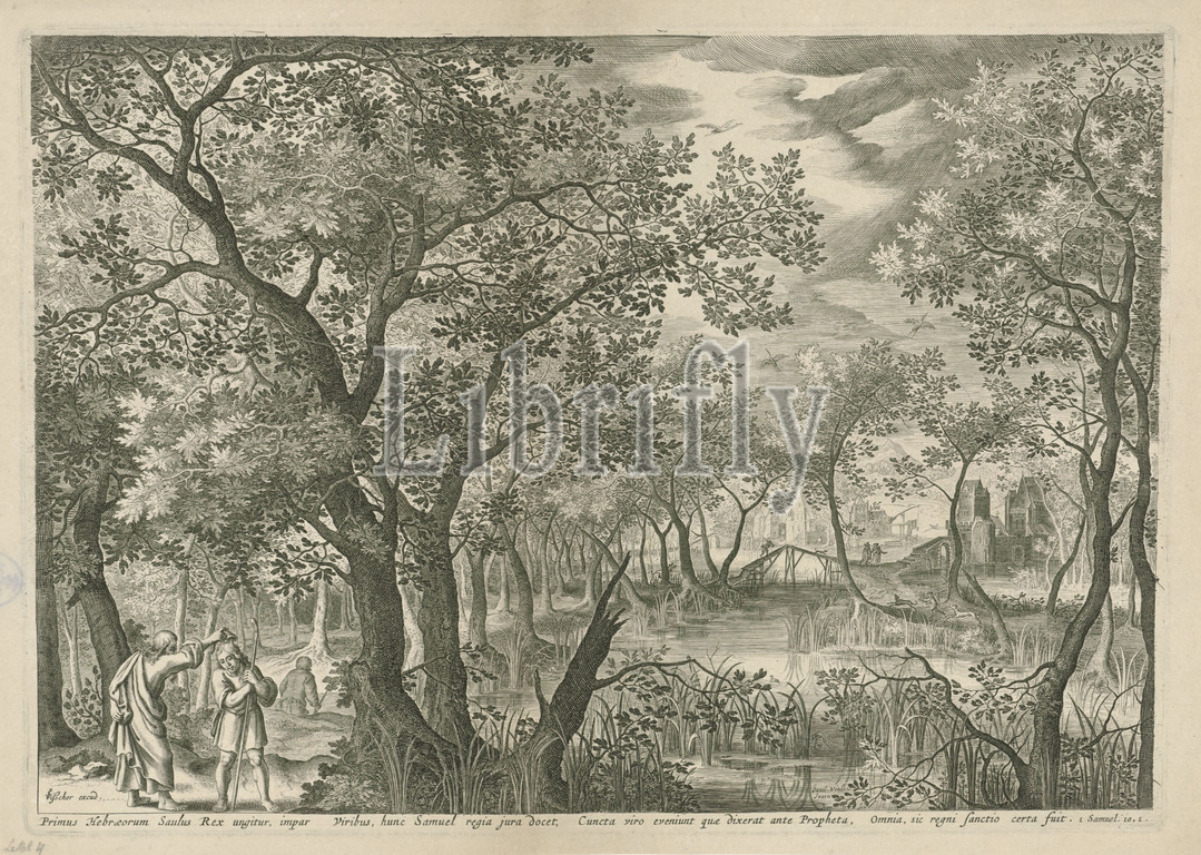 Landscape, Saul anointed, king, Samuel, Water-rich landscape, Saul, anointed, Samuel empties, jug, oil, Saul's head, margin, caption, Latin, bible reference, 1 Sam, 10, 1, anointment, landscapes, waters, waterscapes, seascapes, temperate zone, Jan van Londerseel, mentioned, object, Amsterdam, 1601, 1652, paper, engraving