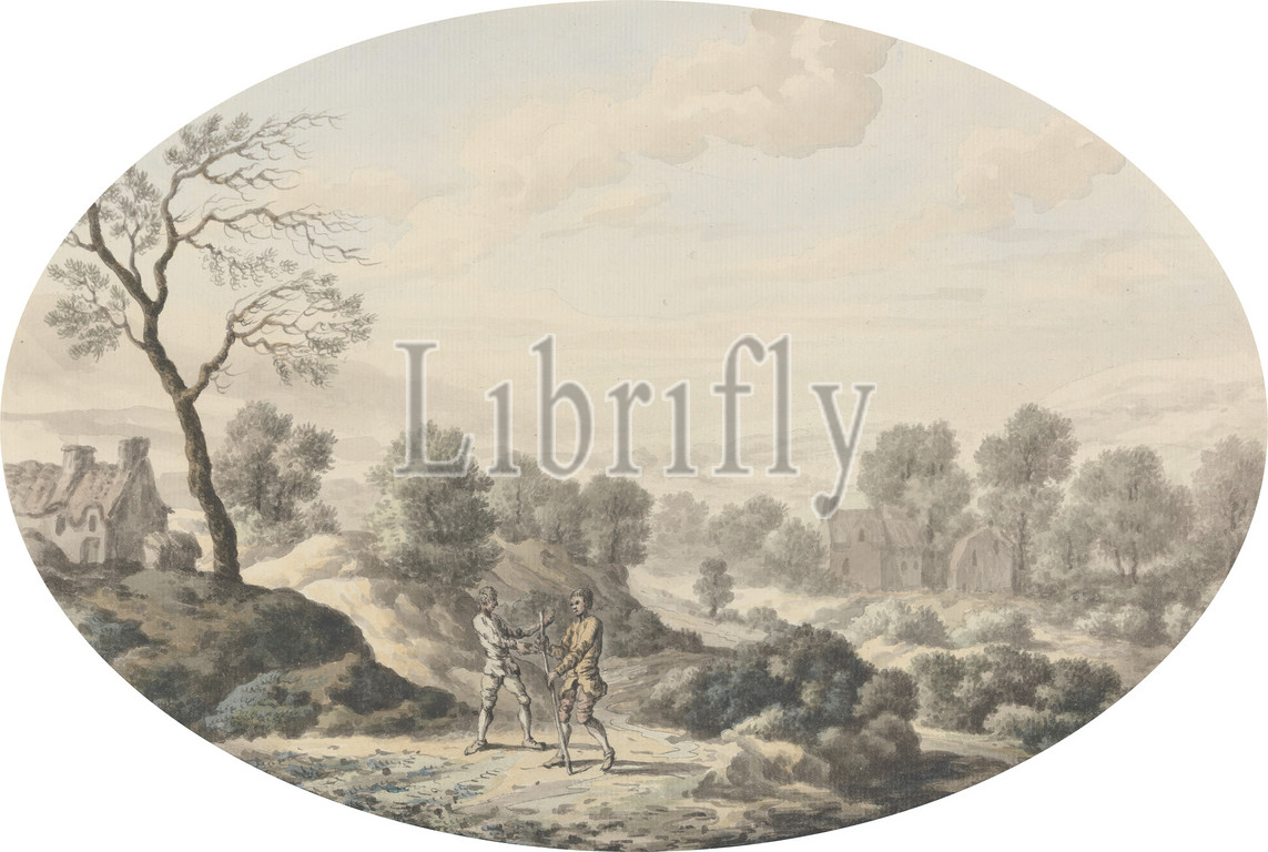 Landscape with Two Men on a Road, George Lambert, 1700–1765, British, undated, Watercolor, pen and black ink, and graphite on medium, slightly textured, cream laid paper, Sheet: 8 7/8 x 13 3/16in. (22.5 x 33.5cm) and Sheet: 12 1/4 × 17 inches (31.1 × 43.2 cm), landscape, men, road, shrubs, trees