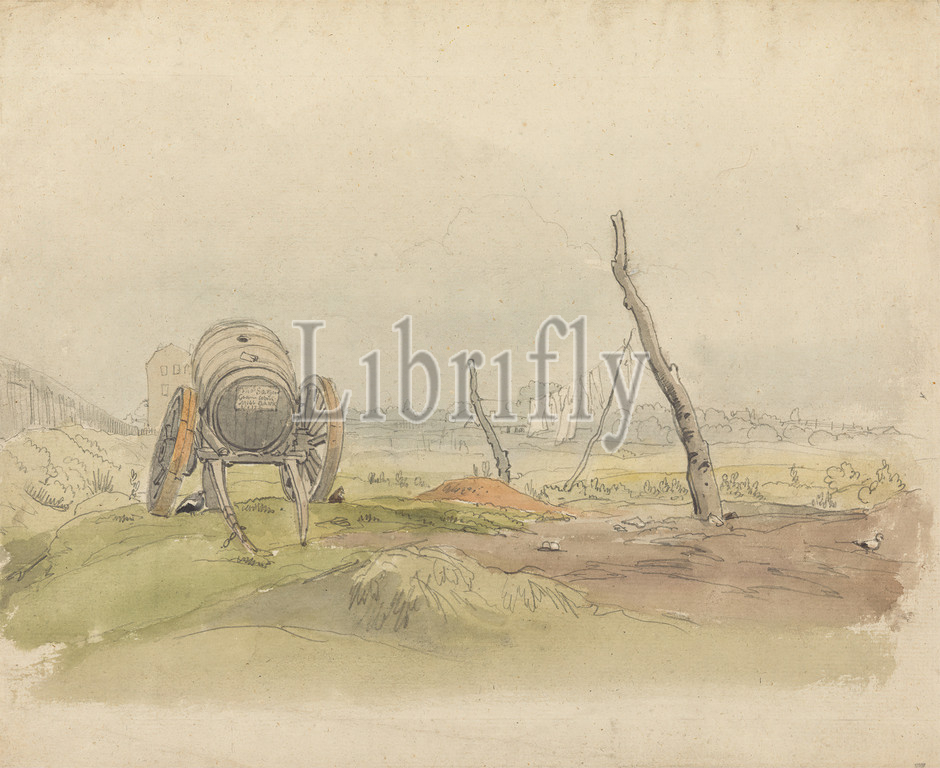 Landscape, Water Cart, Clothesline, Joshua Cristall, 1768–1847, British, Watercolor, graphite, moderately thick, moderately textured, beige laid paper, Sheet, agriculture, barrel, carts, clothesline, grass, hills, landscape, pastoral, rural, water cart, wheels