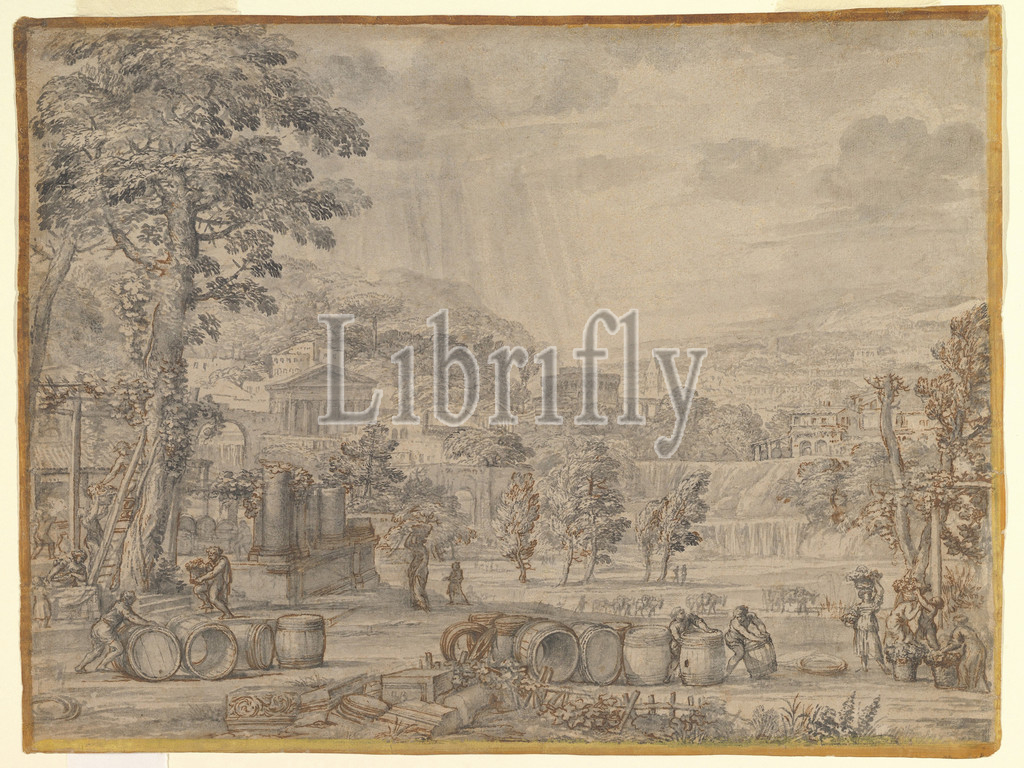 Landscape, Wine Harvest, ca, 1630, Brush, gray wash, touches, pen, brown ink, traces, black chalk, illusionistic frame drawn, yellow, Sheet, 14 9/16 x 19 5/16, 37 49 cm, Drawings, Pietro da Cortona, Berrettini, Italian, Cortona, 1596–1669, Rome, work, artist, mature years, composition, presentation piece, patron, judging, high degree, finish, virtuoso technique, drawing, painted almost, entirely, tip, brush, obtain delicately, pictorial, effects, light, example, rays emanating, clouds, highlights, bark, trees, atmospheric conception, space