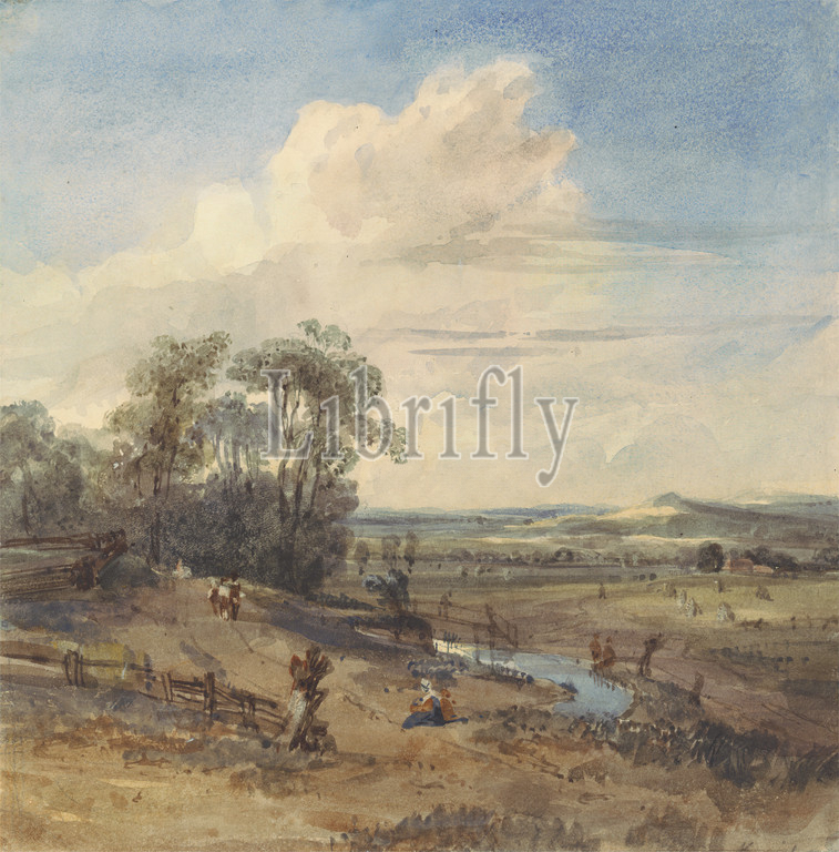 Landscape, Wynants, Louvre, William Callow, 1812–1908, British, active, France, Jan Wijnants, ca, 1635–1684, Dutch, Watercolor, pen, black, blue, brown ink, graphite, scratching out, medium, slightly textured, cream wove paper, Sheet, bridge, built work, clouds, fence, landscape, path, river, sky, trees