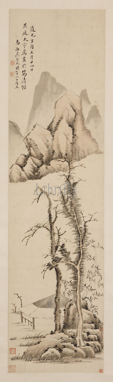 Landscape, Ni Zan, Wú Róngguang, Chinese, 1773-1843, Qing dynasty, 1837, 5/24, ink, light color, paper, 44-1/2 x 11-1/2, image, 73-3/4 x 8-1/4, installed, Signed, artist, Wu Rongguang, Nanhai, time 65 plus years Square intaglio seal, reads, Wú Róngguang yìn Square relief seal, Héwu Four unidentified seals, collectors' seals, Inscribed, 24th day, 5th month, Dingyou year, Daoguang era. Painted, Governor, Yanting, Yunqing Pavilion, Asian Art