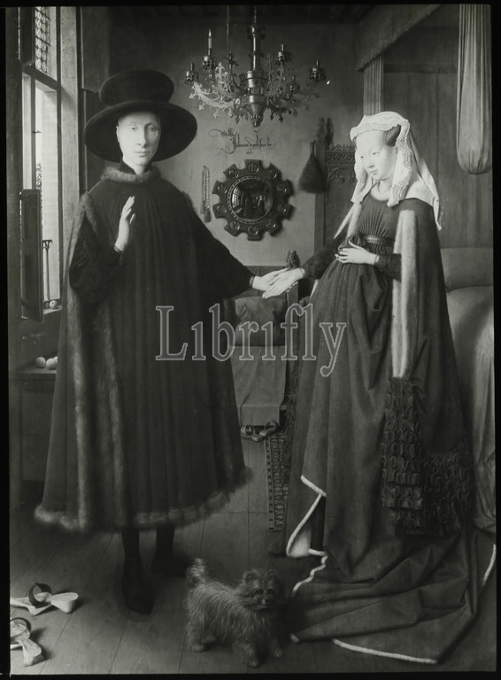 Lantern Slide - 'The Arnolfini Portrait', National Gallery, London, 1909-1930, One of a set of ninety magic lantern slides containing images of artefacts, art works, decorative arts, interiors and furniture which appear to belong to various museum and gallery collections in the United Kingdom. This slide depicts the oil painting by Jan van Eyck titled 'The Arnolfini Portrait', also known as the 'The Arnolfini Wedding', 'The Arnolfini Marriage', and the 'The Arnolfini Double