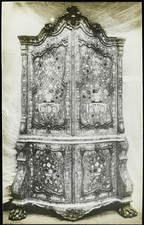 Lantern Slide - Decorative Marquetry Cabinet, 1909-1930, One of a set of ninety photographic magic lantern slides containing images of artefacts, art works, decorative arts, interiors and furniture which appear to belong to various museum and gallery collections in the United Kingdom. The Francis Collection of pre-cinematic apparatus and ephemera was acquired by the Australian and Victorian Governments in 1975.