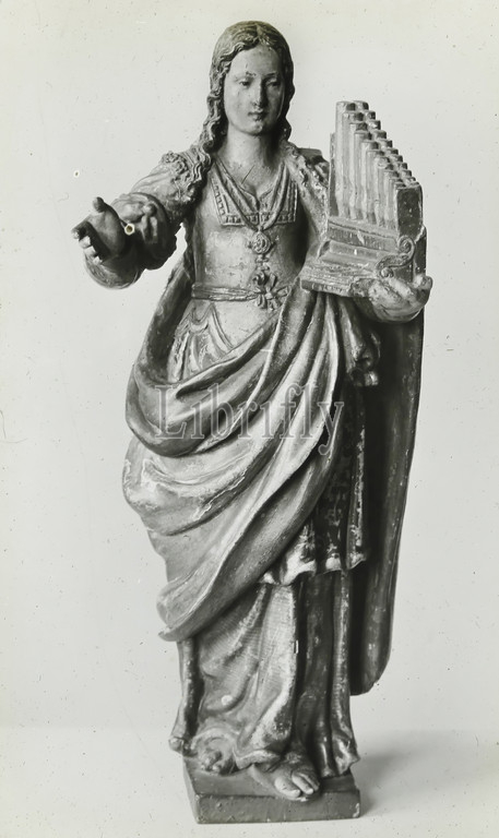 Lantern Slide, Oak Statuette, St Cecilia, Victoria & Albert Museum, 1909-1930, set, ninety photographic magic lantern slides containing images, artefacts, art works, decorative arts, interiors, furniture, belong, various museum, gallery collections, United Kingdom, slide depicts, image, oak statuette, Saint Cecilia, patron saint, music, Seville, circa 1610-1630