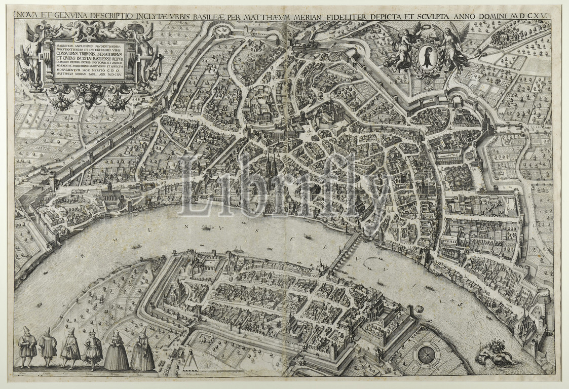 Large birdshow, city, Basel, northeast, 1617, preliminary drawing, 1615, etching, four plates, composed, four arches, mounted, image, 70.5 x 105.5 cm, 35 x 53.5 cm, O. inscribed, signed, dated, NOVA ET GENVINA DESCRIPTIO INCLYTAE VRBIS BASILEAE PER MATTHAEVM, ..., M D CXV., Matthäus Merian d. Ä., Basel 1593–1650 Bad Schwalbach