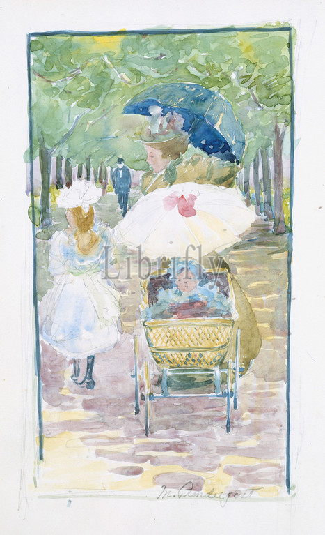 Large Boston Public Garden Sketchbook, mother pushing, baby, perambulator, daughter, side, 1895–97, Recto, watercolor, pencil, bordered, 14 1/8 x 11 3/16, 35.8 28.4 cm, Drawings, Maurice Brazil Prendergast, American, St. John’s, Newfoundland, 1858–1924, New York