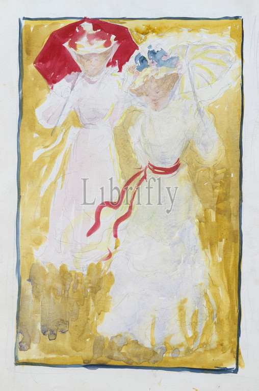Large Boston Public Garden Sketchbook: Two women crossing a field, 1895–97, Recto: watercolor over pencil, bordered in pencil and watercolor, 14 1/8 x 11 3/16 in. (35.8 x 28.4 cm), Drawings, Maurice Brazil Prendergast (American, St. John’s, Newfoundland 1858–1924 New York)