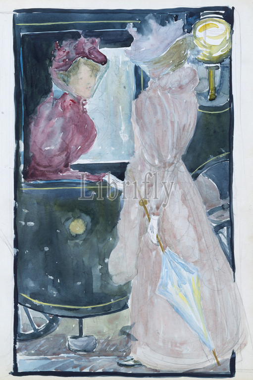 Large Boston Public Garden Sketchbook: Two women stopping to converse with an acquaintance riding in a carriage, 1895–97, Recto: watercolor over pencil, bordered in watercolor and pencil, 14 1/8 x 11 3/16 in. (35.8 x 28.4 cm), Drawings, Maurice Brazil Prendergast (American, St. John’s, Newfoundland 1858–1924 New York)