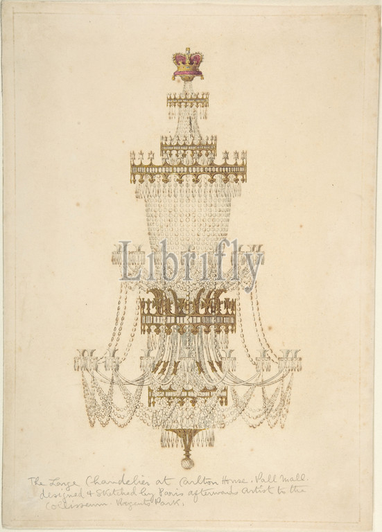 Large Chandelier, Carlton House, Pall Mall, 19th century, Ink, wash, watercolor, sheet, 12 x 8, 30.5 20.3 cm, Edmund Thomas Parris, British, Middlesex, 1793–1873, London