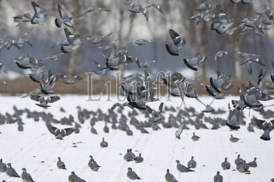 large flock, Woodpigeons, feeding, snow, arable field, Netherlands, nature, bird, animal, wildlife, wild, fauna, natural, feather, sky, beak, wing, outdoor, freedom, colourful, Liszt, Natural History, ornithology, vertebrate animals, photography, color image