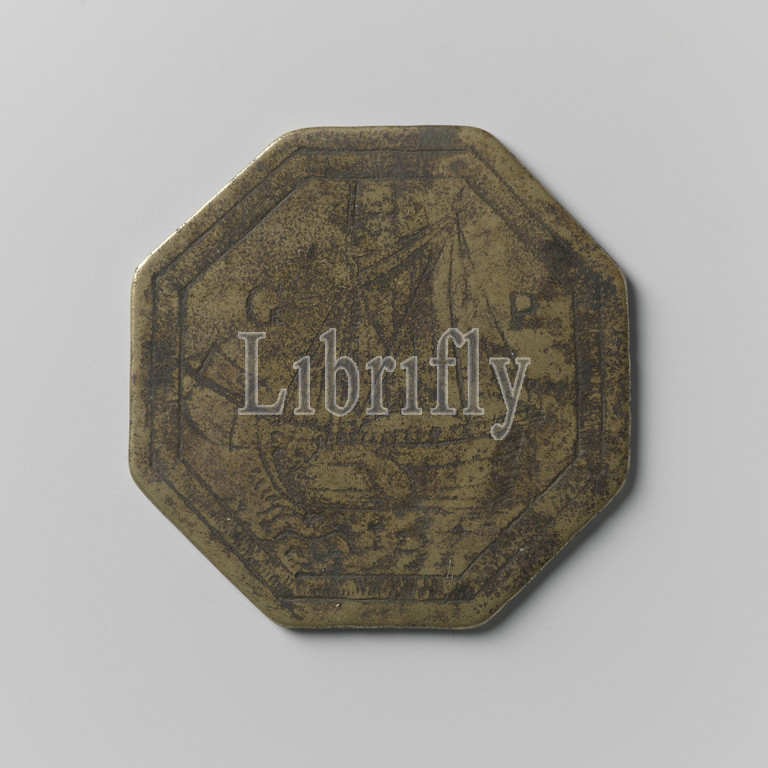 Large skipper's guild from Franeker, guild token from Beern Jansen, brass octagonal medal. Front: ship sailing to the left between letters G and P within cable edge. Reverse: coat of arms above inscription inside cable edge, Franeker, Beern Jansen, anonymous, 1645, brass (alloy), engraving, h 4.6 cm × w 4.5 cm × w 23.76 gr