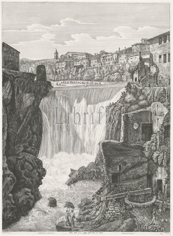Large waterfalls, Tivoli Veduta della Gran Caduta dell 'Aniene, Tivoli, View, large waterfalls, low view, foreground, right bank, two men, whom points, falls, right, man, drawing folder under, arm, Numbered lower right, T, 26, waterfall, landscapes, Luigi Rossini, mentioned, object, Rome, 1825, paper, etching