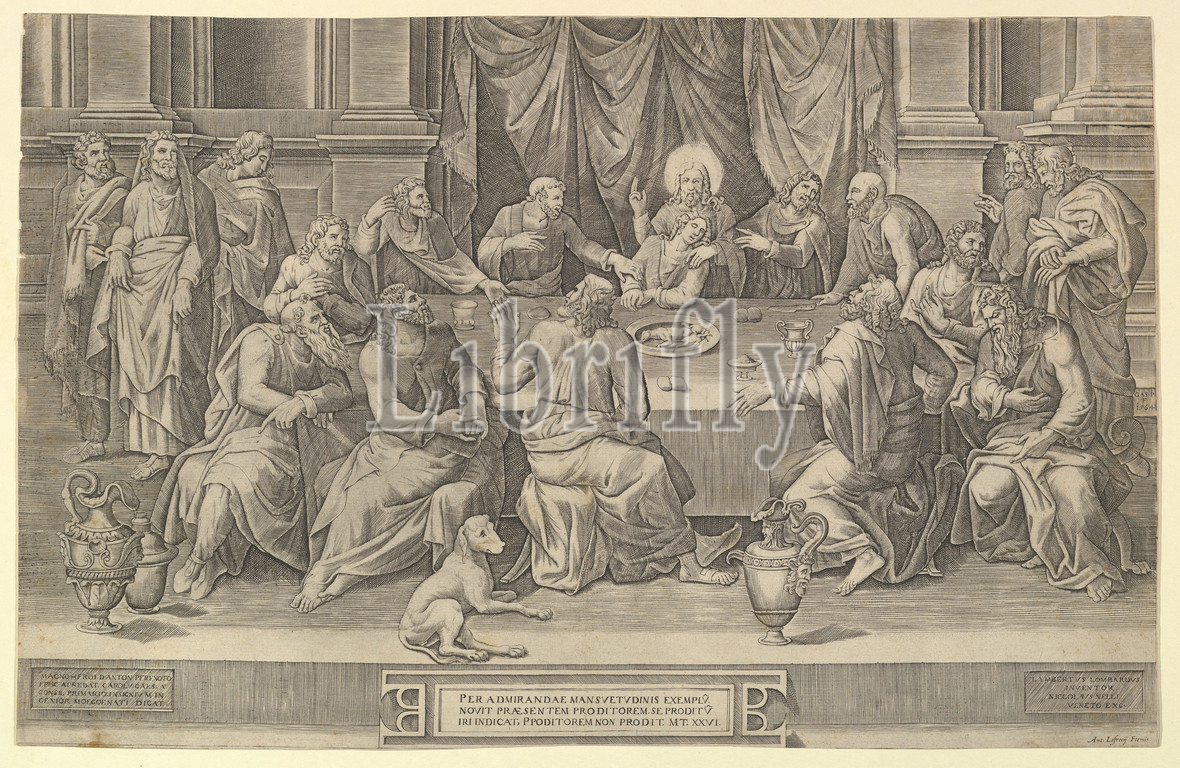 The Last Supper, 1564, Engraving, 13 11/16 x 21 5/16 in. (34.7 x 54.2 cm); trimmed, Prints, Gaspare Osello (Italian, ca. 1536–1560/80), After Giorgio Ghisi (Italian, Mantua ca. 1520–1582 Mantua), After Lambert Lombard (Netherlandish, Liège 1506–1566 Liège)