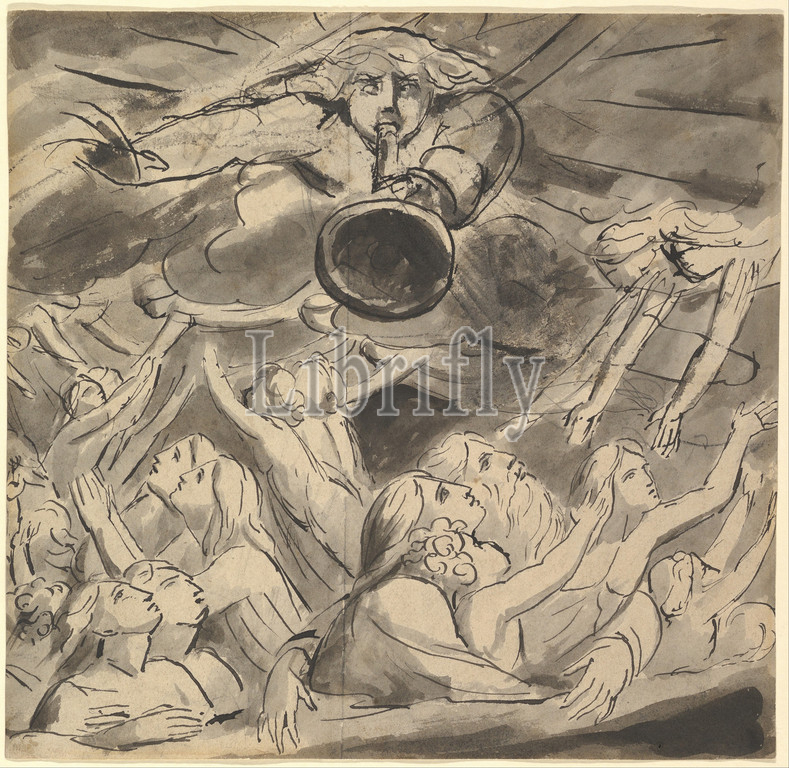 The Last Trumpet (recto); Two studies of a right eye, a profile of an open-mouthed young man, the head of an eagle, and the head of a lion (verso), ca. 1780–85, Pen and gummed carbon black ink and layered gray ink washes with graphite underdrawing; verso: black chalk, sheet: 8 1/16 x 8 3/8 in. (20.5 x 21.2 cm), Drawings, William Blake (British, London 1757–1827 London), In this dynamic working drawing Blake, Britain's great early Romantic poet/artist, presents the resurrection of believing souls at the last day. The image echoes lines from Saint Paul’s First Letter to the Thessalonians (4:15–17): 'For the Lord Himself shall descend from heaven with a shout, with the voice of the archangel, and with the trump of God, and the dead in Christ shall rise first