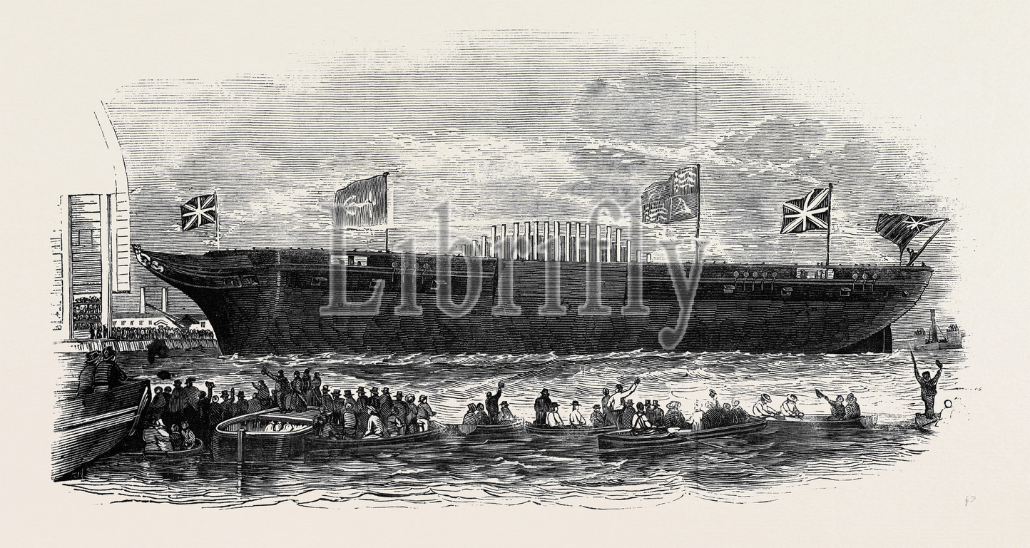 launch, steam, frigate, terrible, thursday, afteron, majesty's, dock-yard, deptford, 1845 engraving, engraved image, history, illustrative technique, engravement, victorian, arts, culture, retro styled, vintage, retro, arkheia