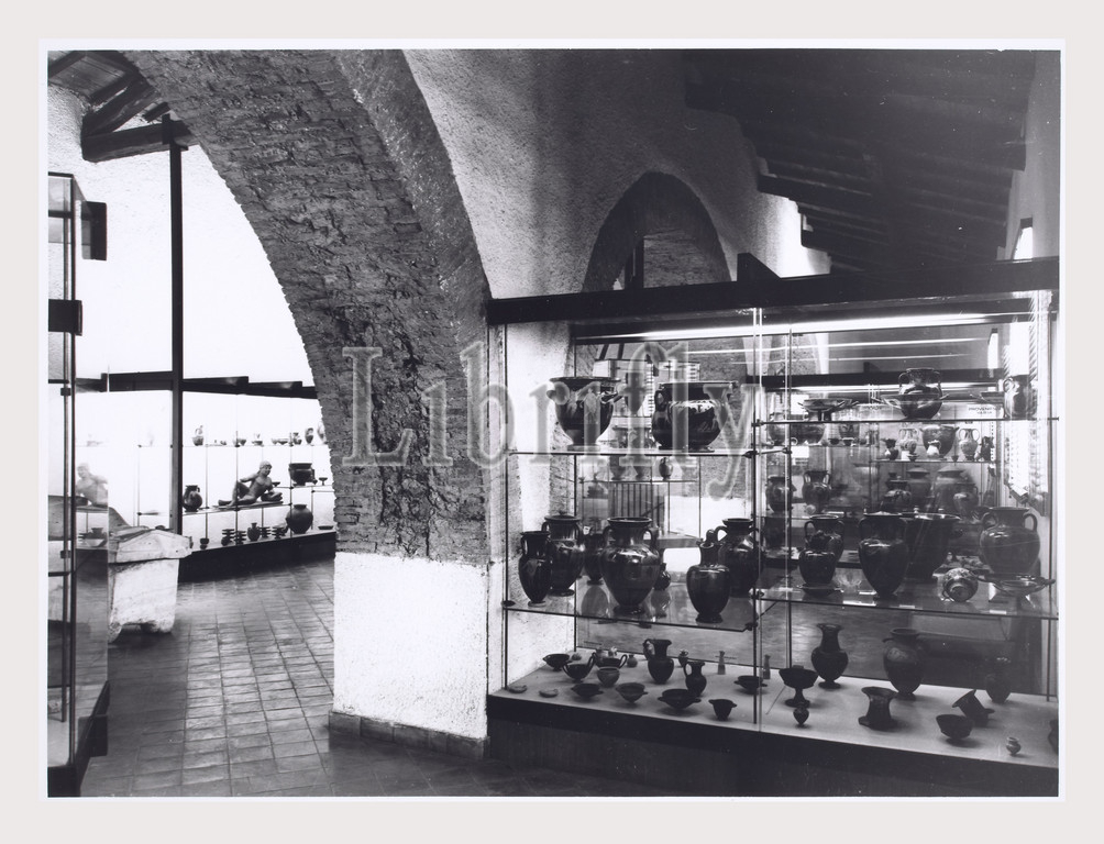 Lazio Roma Cerveteri Museo Nazionale Cerite, this is my Italy, the italian country of visual history, Antiquities General views of museum interior and collection of ancient funerary items. terracotta vessels. Some headless statues and a detail of two heads and an antefix. 9th to 1st century B.C.