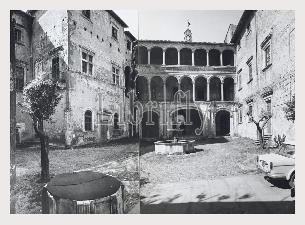 Lazio, Roma, Rome, Genazzano Castello Colonna, Italy, italian country, visual history, Exterior views, originally, medieval, structure, rebuilt, 1400s, Baroque period, Views, loggia, fountain, niched Roman statue.Photo 1983