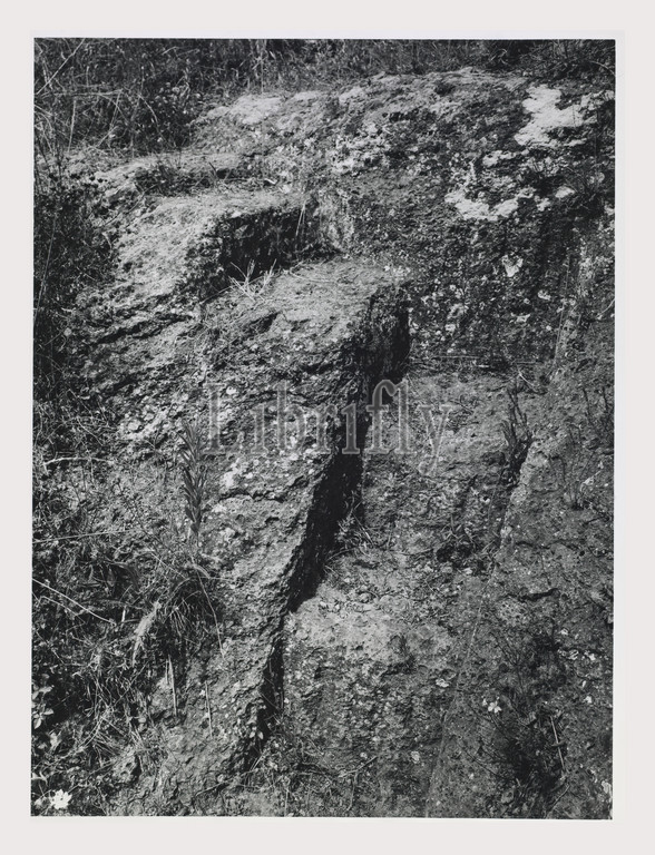 Lazio Viterbo Blera Etruscan Necropolis, this is my Italy, the italian country of visual history, Antiquities 6th-5th centuries BC Etruscan necropolis tufo tombs cut to resemble houses with tufo cut "furnishings", streets, niches for cinerary urns, bridges, cloacae, Photo 1984