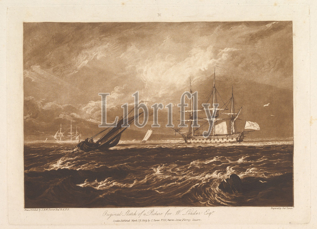 Leader Sea Piece, Liber Studiorum, part IV, plate 20, March 29, 1809, Etching, mezzotint, first state, three, plate, 7 x 10 3/16, 17.8 25.9 cm, Prints, Designed and etched by Joseph Mallord William Turner, British, London, 1775–1851, Turner distilled, ideas, landscape, Latin, Book, Studies, series, seventy prints, plus, frontispiece published, 1807, 1819, establish, compositions, brown watercolor, drawings, etched outlines, copper plates