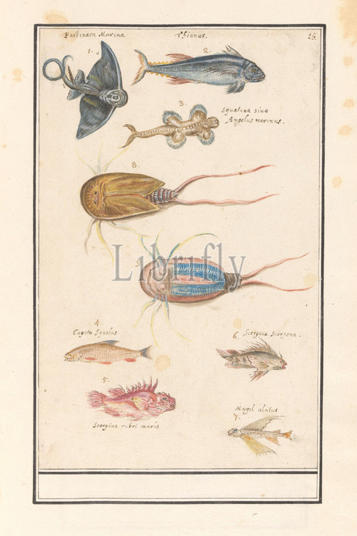 Leaf, seven different fish, horseshoe crab, numbered 1-7, 8-9, Partly, Latin names, Numbered top right, 25, Part, sixth album, drawings, fish, shells, insects, Sixth, twelve albums, animals, birds, plants, 1600, commissioned, Emperor Rudolf II, explanations, Dutch, Latin, French, fishes, crustaceans, Anselmus Boetius de Boodt, 1596, 1610, paper, watercolor, paint, deck paint, ink, pen