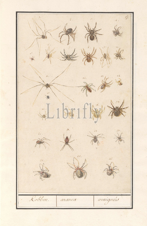 Leaf, spiders, Kobben, aranea, araignées, title, object, Sheet, twenty-six different spiders, numbered 1-26, Numbered top right, 17, Part, sixth album, drawings, fish, shells, insects, Sixth, twelve albums, animals, birds, plants, 1600, commissioned, Emperor Rudolf II, explanation, Dutch, Latin, French, NAME, Anselmus Boetius de Boodt, Praag, 1596, 1610, paper, pencil, chalk, watercolor, paint, deck paint, ink, pen